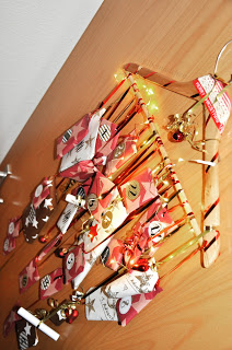 Das Ganze wird dann schön verpackt, mit Nummern versehen und an einen hübsch dekorierten Kleiderbügel gebunden. Der passt notfalls auch an einen Haken über eine Tür und kostet nicht unnötig viel Geld, weil man ihn ohnehin im Kleiderschrank hängen hat.